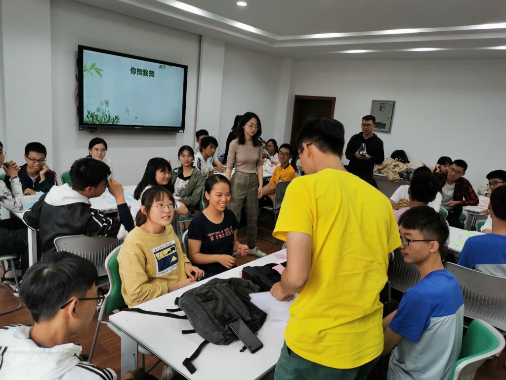 第一个环节为游戏“滚雪球”:以小组为单位,每一位同学需要用一句话介绍前面的同学的籍贯与爱好并同时介绍自己,用时最长的一组需接受表演节目的惩罚。(“败者组”派出代表黄项龙献出一曲《苦瓜》,曲终,掌声雷动。)