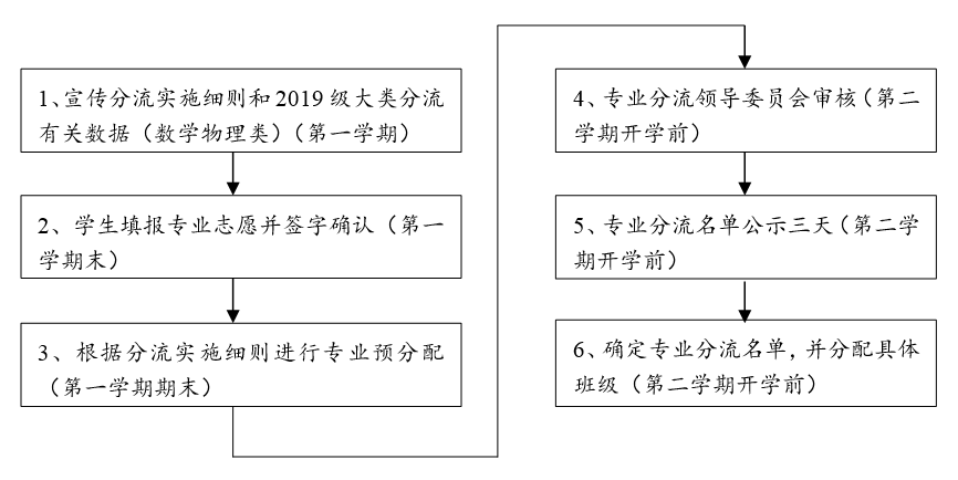 数学物理类专业分流工作从大一第一个学期末开始(具体时间以本科生院的通知为准),流程如下: